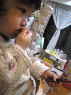 相変わらず食べないマナ。(-.-;)あれやこれやと工夫して出してみても全く手付かずで終わってしまう。そんな中、唯一食べてくれるのが「国産牛」( ̄▽ ̄;)しかも薄くスライスされた物で1枚100円くらいするやつ。当然のことながら半額狙って買いに行きますけどねf^_^;写真のように両手いっぱい持って食べるのが今のマナスタイル。ただ、この後……このお肉、床にちらほら落として「ごちそうさま」されました(>_<)