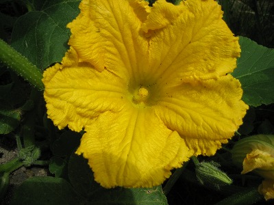 庭の植物 かぼちゃの花 (雄花)実際にはこれよりずっと大きくて10センチ以上ある 葉っぱはなんと30センチ! 雌花にちいさな実がついていた知らない間に生えたかぼちゃにちょうちょや蜂がきて自然交配したらしい夏の厳しさに負けないで大きく育ってね!