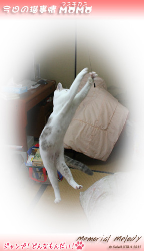 4月22日 曇 部屋の照明をつけた犯人はももちゃんです!現場検証で状況がわかりました。このジャンプ力ですよ!なんと華麗なるジャンプ!実は、このジャンプ力の秘密は、あの猫背にあるようです。後ろ足のバネのようなキックを支えているのが猫背。背骨の間の筋肉の結合が非常に柔らかく、バネのようにしならせて瞬発力を得ることができるんですね。飛び上がる瞬間に一気に後ろ足の膝を伸ばすことで、助走がなくともこんなジャンプができるんです。ちなみに、ももちゃんは、興奮気味の時は、ワイヤーアクション級のジャンプをします。ジャンプして壁や柱を蹴り飛ばし、さらに遠くへジャ~ンプ!です。思わず、ポカ~ンです。猫ってすげーーー!(@o@;)ランキングに参加してますポチッと応援してくれると、とってもうれしいです!↓にほんブログ村 写真ブログ人気の写真ブログもチェック!写真共有サイト「フォト蔵」◆猫雑貨・猫グッズUV99%カット 猫プリント晴雨兼用ジャンプ傘354119 ネコ(ベージュ)/マンチカン(ピンク)◎エンボス水玉プリントシルバーコーティング。裏面にねこ写真プリントが施してある、晴雨兼用長ジャンプ傘です。◎UVカット99%の晴雨兼用でペットとの散歩に是非どうぞ。■親骨の長さ60cm 全長87cm 開時の直径100cm 重さ600g■素材:ポリエステル100%価格 2,980円 (税込 3,129 円) 送料込SHOP:セレクトプラス22万人が感動のギフト!宇治抹茶スイーツ竹かごセット抹茶カステラやお花を模した抹茶菓子と摘みたての新茶入り宇治茶 伊藤久右衛門京都らしいはんなりアレンジのお花と宇治抹茶スイーツ&新茶set大輪のカーネーションに挽きたて抹茶が香るフィナンシェを添えて宇治茶 伊藤久右衛門2012年新作!母の日「花咲き」竹かごセット豪華版 濃厚抹茶スイーツなど9種setにカーネーションを添えて宇治茶 伊藤久右衛門母の日特集2012 抹茶スイーツ宇治茶 伊藤久右衛門《 2012/4/17 |記事一覧|2012/4/19 》■今日の猫事情