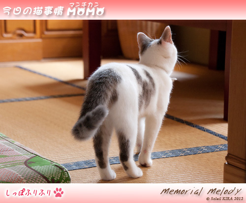 4月23日 雨 ももちゃんのしっぽ!尻尾が意外に長い!そして、これが繊細によく動く・・・ふりふり。これはいつものポジション。尻尾は下がっていて先がヒョイッと上がっています。でも、うれしい時、ご機嫌な時、おねだりや甘えたい時は、尻尾を垂直にピンと立てています。そして、人の体や家具などにも尻尾を巻きつけるようにスリスリします。尻尾って、柔らかくてふにゃふにゃしているイメージあるけど、ピンとしているときはそれがそうでもない。けっこう筋肉ついてるんだね!朝は大抵、スリスリ挨拶してきます。いわゆる友好条約!部屋から私が出てくるのをまっているのか?扉を開けるとまとわりつくようにスリスリしてきます。だけど、毎回トイレに入る時が困る。・・・入ってくるなよ!抱っこをしたときにしっぽをパタパタと早く揺らすときは降ろしてほしいという合図らしい。また、何かに怯え警戒心がピークになると、しっぽを下げ股の間に挟んだりします。他にも、猫の気持ちがしっぽでいろいろ読み取れるようですよ。ランキングに参加してますポチッと応援してくれると、とってもうれしいです!↓にほんブログ村 写真ブログ人気の写真ブログもチェック!写真共有サイト「フォト蔵」◆猫用品・猫グッズキャットランド専用つめとぎシートCLT-280キャットランド専用の別売爪とぎシートです。マジックテープ付きですので、簡単にシートの追加や交換が行えます。爪とぎシートは両面使用できます。●サイズ(cm):幅約32.5×奥行き0.5×高さ約28●材質:麻価格 743円 (税込 780 円) 送料別口コミ・感想・評価SHOP:キャットランド《 2012/4/22 |記事一覧|2012/4/24 》■今日の猫事情
