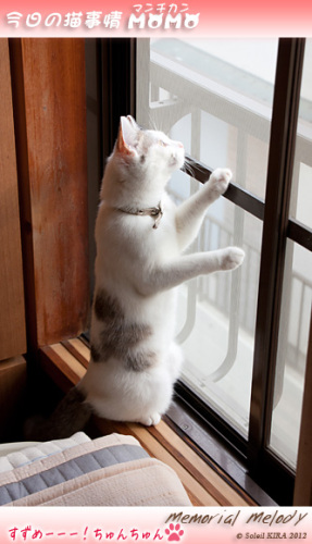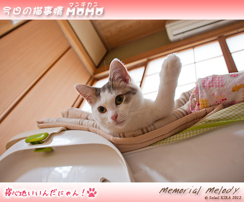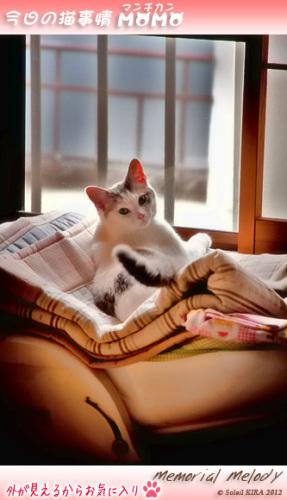 4月30日 曇写真はお気に入りのベビーラックで寝ているももちゃん。photoshopでちょっと色合いを加工してみました。ベビーラックを外が見えるようにちょっとずらしみた。下を通る人をみたりしています。今日は午前中、虫を猫パンチで叩き落としたらしい。ハエらしき小さな虫がサッシのサンに落ちているのを一生懸命取ろうとしてました。ももちゃん、(*^ー゚)b グッジョブ!!虫はティッシュでとって捨てました。。。事情があり2日間、夜中にケージにいれずに野放し状態でしたが、今日からまたケージで寝てちょうだいね。ランキングに参加してますポチッと応援してくれると、とってもうれしいです!↓にほんブログ村 写真ブログ人気の写真ブログもチェック!写真共有サイト「フォト蔵」◆猫本猫毛フェルトの本 うちの猫と作る簡単ハンドクラフト猫の毛でフェルトを作ってみたら、こんなにかわいい雑貨ができました。1,100円(税込)送料無料口コミ・感想・評価SHOP:楽天ブックス鉢植え「アジサイ 未来」【送料無料】世界的に評価されてる限定品種のアジサイイイハチナナ・ドットコムアレンジメント「ロマンティック・エデン」上品な雰囲気がお母さんの優しい表情を引き出しますイイハチナナ・ドットコム母の日 鉢植えセット「苺ミルクのバームクーヘン」上品な雰囲気がお母さんの優しい表情を引き出しますイイハチナナ・ドットコム母の日特集2012 イイハナ・ドットコム《 2012/4/17 |記事一覧|2012/4/19 》■今日の猫事情
