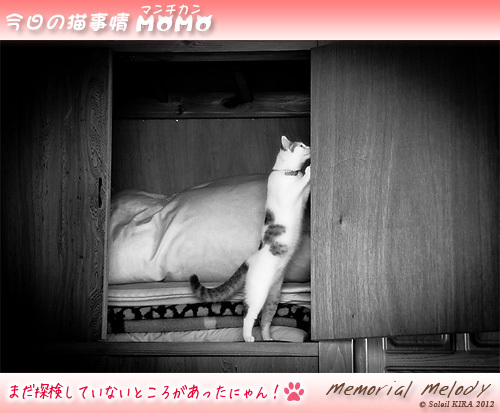 4月19日 曇 押し入れが開けっ放しーーー!あーあっ!入っちゃった!はじめての場所に興味津々。ここはまだ探検していない空間。どうなっているのか、奥が気になるらしい。「こらっ!」と声をかけると、一応、怒られていることがわかっているのか、情けない鳴き声を出しつつも、下りようとしない。ももちゃん:「まってよ~、もうちょとだけ見せてよ~」と言っているかのようですが・・・?ジャンプして奥まで入り込んでました。。。とりあえず、この押入れは探検済みとなりました。ランキングに参加してますポチッと応援してくれると、とってもうれしいです!↓にほんブログ村 写真ブログ人気の写真ブログもチェック!写真共有サイト「フォト蔵」◆猫グッズ黒猫ちゃんが玄関でお出迎え!可愛らしい猫の傘立てかわいい黒猫ちゃんがお出迎え!オシャレなアンブレラスタンド当店特別価格 8,800円 (税込) 送料込SHOP:アージュ輸入家具《 2012/4/17 |記事一覧|2012/4/19 》■今日の猫事情