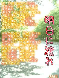 お久しぶりです(^_^)/~今日学校のイベントである合唱コンの練習がありました!!わたしのクラスは『明日に渡れ』を歌います♪まだビミョーに音程がとれてないけどがんばります(^O^)/