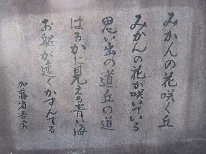 伊東市の宇佐美からスカイライン亀石峠へ向かう途中にみかんの花咲く丘の歌碑があります。季節的に花は咲いていませんでしたが、みかんが実っていました。 これが歌にある♪~~♪はるかに見える青い海~~♪とはこのあたりから見たこの景色なのかなぁと思いながら・・・・ちょっと歌いたくなる場所です
