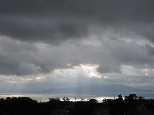 今朝は大島にスポットライトのように光が降り注いでいました。あまりの美しさにダッシュ写真を撮りました。ほんの数分で景色が変わりました