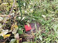 中央の赤いものが境界杭です。草をかき分け全て確認しました。