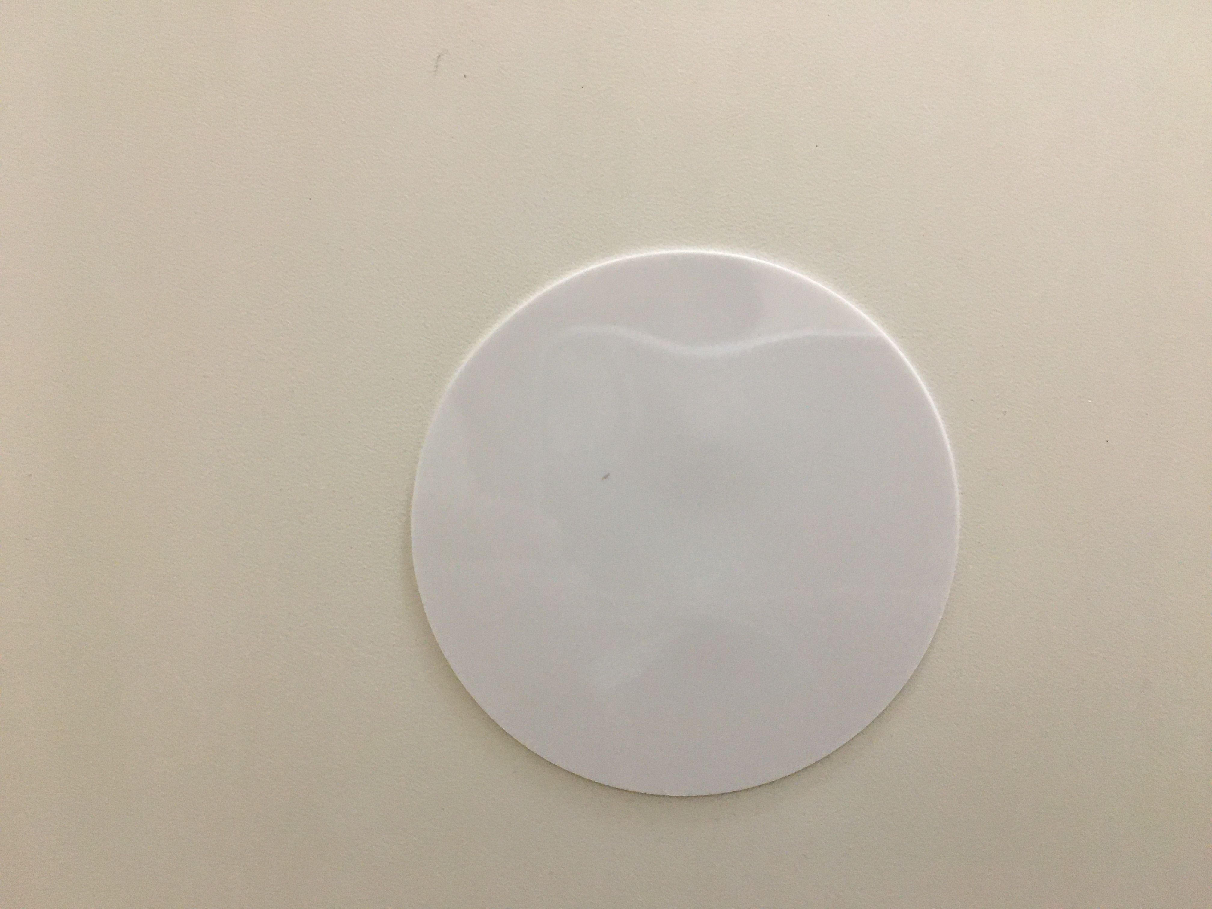 穴の上に、付属の補助板(写真のような丸いシールです。)を貼ります。本体が着きやすくなります。