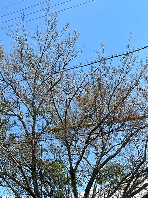 アパート前の木をみると、毛虫が葉を食べつくしたようで、葉がほとんどなくなってます。この木から移動してきたようです。