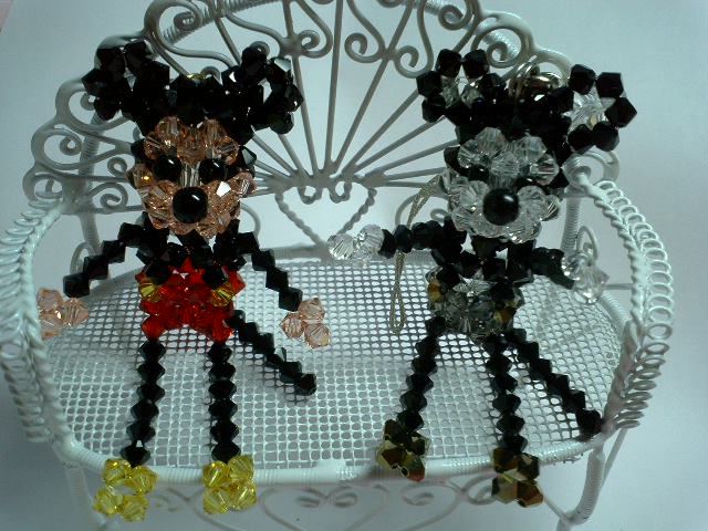 最近、ワイヤーはお休みして、モチーフに嵌ってます。色んなモチーフがあって作っても作っても飽きないですね~。色々作ってやっぱり、ミッキーマウスに戻ってきました。来年は子年なので、ミッキーマウスを持つといいかもしれませんしね~。ディズニーはメジャーなので、若い人からお年寄りにまですぐにわかってもらえるので、やっぱりいいな~!と思います。昨日のナミエパンサーで、手足の長いモチーフが可愛いと思ったので、以前買ったレシピの中で、まだ作ってなかった手足の長いミッキーマウスを作ることにしました。やっぱり可愛いです~!以前ネットでレシピを捜してるときに、モノクロミッキーと言うのがあったんですが、その頃は色つきばかりに目が行ってたんで興味がなかったのですが、さんざん色んな物を作ってるうちに、モノクロもいいかな~なんて思うようになりました。モノクロだと、男性が持ってもいいんじゃないかと思うんですよ!で、同じレシピで、モノクロもつくってみました!では、どうぞ!今日、ヤフーオークションを見てたら、たくさんレシピが売られてて、又大量買いしてしまいました。届くのがた・の・し・み!