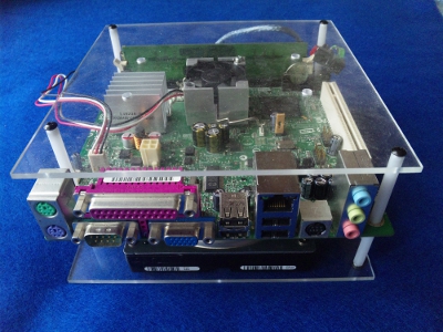 ネットに特化し、静かで、消費電力も低く、できるだけ小型に、そして、他にはないイメージのケースを作るということで第25回目です。17cm×17cmの透明アクリル板3mmに変更しました。今までは乳白色の塩ビ板を使用していました。厚みが約1.2mmと加工するには楽でした。強度も最低限あったと思うのですが、少し不安があったので3mmの透明アクリルに変えました。作り方は今までと同じです。アクリル板にマザーボードとHDD固定用の穴を開け、まずHDDを固定します。 次にM3ネジとスペーサーを通します。マザーボードを載せ、プラスチックワッシャーをかましてM3ナットで固定、スイッチ電源類を入れて完成です。アクセスランプと電源ランプは市販品のものです。COMON社の「LED・スイッチ実験用set」というものを使用しました。ただ、このマザーボード(D945GCLF2)ではPower(電源)LEDのアクセスランプが使えませんでした。購入したLEDは3Pin。マザーボードは2Pinです。そこでピンを入れ替えました。入れ替え方はこちらにあります。ここをクリックこのやり方で簡単に入れ替えることができました。まぁ、無くても最低限使えるはするのですが。。厚みが約2倍になり、アクリルになったことも関係してか、前より強度は増しました。透明が良いか、乳白色が良いかは好みが分かれるところかもしれませんね。私はどちらでも良いかと思います。