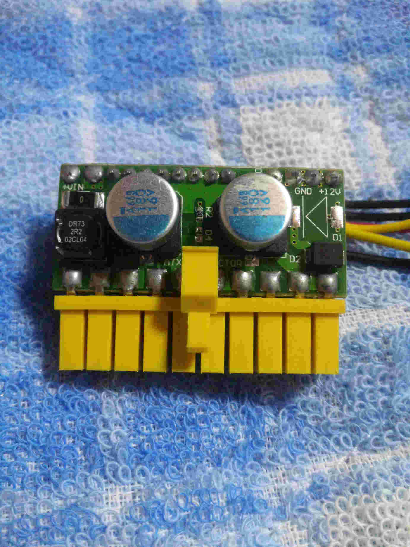 ネットに特化し、静かで、消費電力も低く、できるだけ小型に、そして、他にはないイメージのケースを作るということで第5回目です。最後は電源です。PICOPSUというACアダプターを利用した小型電源があります。この電源は小さくて、ファンがなく今回のコンセプトにはぴったりです。前々から気になってた部品です。容量は120Wまでいけるようですが、120WのACアダプターが結構高い。。今回ひょんなことからこのニセモノらしきものを手に入ったのでこれを使用します。詳細は不明。PICOPSUと似ていますが、本物と比べると若干違うようです。プリントされているであろう「PICO PSU」の文字が見えません。怪しいです。 怪しい電源 PICOPSUのニセモノか?ACアダプターはDELLの中古品「ADP-150BB B」というものをオークションで購入しました。このアダプターのコネクタの形状は特殊な形状をしており、そのままつなげるのは無理そうなので自分で合うものに変えました。変え方は簡単。コネクタを切断。緑、白、黒、黄、茶、赤の6本の線が入っているので、緑、白、黒、を1つにまとめます。これが「-」。残りの茶色と赤を1つにまとめます。これが「+」。黄色は使いません。私は圧着端子でつなげました。これでパーツは一通り全部そろいました。