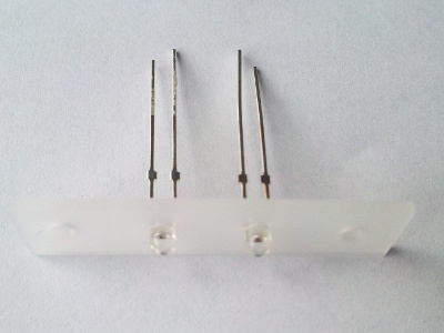 ネットに特化し、静かで、消費電力も低く、できるだけ小型に、そして、他にはないイメージのケースを作るということで第10回目です。前に電源を作ったのですが、ユニバーサル基盤を使うと美しくないので、少し変えてみました。HDDと電源のアクセスランプを変更です。LEDはいろいろな色やサイズがあり、色は赤、緑、オレンジ、形は砲弾型や角型、Fluxと呼ばれる四角のものなど様々あります。今回はその中で3φの砲弾型LED青色を使用しました。色は最近はやっているようなんで青を選択、3φを選択したのはたまたまそれしか手に入らなかったからです。あれば別に5φでもなんでも良かったんです。ただ砲弾にしたのは理由があります。3φの砲弾だと板に3mmの穴を開けると上手くはまってくれます。おそらく5mmの穴を開けると5φのLEDは上手くはまってくれるでしょう。そこでプラスチック板を適当に切ります。今回は1cm×4cmに切ったものを2枚用意しました。そして3mmの穴を2つ開けたものと4つ開けたものを用意します。 この穴に青色の3φLEDを差し込みます。 青色の砲弾型3φLED 差し込んだ様子最初は少し硬いですが、少し「グッ」と押し込めば入ります。これでユニバーサル基盤を使わず、LEDを固定することができました。3mmの穴が2つ開いた板が1枚残りましたね。それと配線。この2つは次回やろうと思います。今回使用したもの・塩ビの板・Pカッター・3mmドリル・LED3φの青色・定規と油性マジック