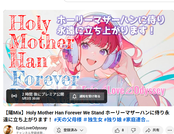 【陽Mix】Holy Mother Han Forever We Stand ホーリーマザーハンに侍り永遠に立ち上がります!2025/05/02にプレミア公開❤️ホーリーマザーハンを疾走する曲で、爆音でお楽しみください。ホーリーマザーハンでトランスしましょう😆心情貫いていくために制作👍世の中にはホーリーマザーハンが必要です✨しっとりバラードな賛美とは逆張りで、トランスしてホーリーマザーハンを賛美します。勢いで制作したため細かい歌唱ミスを無視してリリース👍なんか調整したかったけど、なんかこの勢いでそのままぶっちぎりで配信。テロップのとおりに歌っている!と錯覚して聞いてください😆2世圏、3世圏にはこれくらいのBEATと躍動感で、日本の現状を乗り越えよう✨✨✨これが賛美に値するのか?もう心情が乗れたらいいと思っております。そもそも既存の賛美歌スタイルではないし😅天の父母様聖会 個人的には、ジャンルとしてはHoly Pop、Holy Techno、Holy Trans==歌詞==Holy Mother Han Forever We Stand作曲・編曲 SUNOai作詞・編集373Yeah, rising with the lightbreaking through the darkTrue Parents leading usigniting the sparkOne love, one heartreaching for the skyFrom Heaven’s embracenever asking why砕かれた感情 悔しい過去を 取り戻す光が射す時代の夜明けBreaking through the darkit’s a holy spark진리의 빛이 다가와One love, one heartnever torn apartHoly Mother Han standing strong侍る心、一つの願い독생녀를 사랑해온 세상이 춤춰6000년 기다린 기적이야지금 일어나 외쳐봐 Rise and shine we break the chains 하늘 부모님 사랑 영원해Through the fire through the rain光を見上げて導かれる道真の父母様愛の響き全ての人へ届く祈り天の父母様永久に共にHeaven’s loveshining brightguiding every soul tonight 愛はひとつ どこまでも広がるBound by grace lifted high never lost we unify 真実の愛 響き渡る大叙事詩が啓き天が役事する祝福の言葉霊界も騒ぐすべての命Every heartbeat every breathThrough the pain through the testHoly Mother Han, Holy Mother Han! 하늘 부모님, 6000년 기다렸어全ての涙は喜びに変わる독생녀를 사랑해온 세상이 춤춰 天の父母様の愛永久に響けHoly Mother Han, Holy Mother Han! One family under Godone love, rejoicing in the light世界中が歓喜し 輝く未来へNo borders, no chainslove will remain True Parents guide usbreaking the pain Holy Mother Hanforever we standOne family under Godone lovelifting our handsHoly Mother Han, Holy Mother Han! Holy Mother Han, Holy Mother Han!Holy Mother Han, Holy Mother Han! One family under God世界中が歓喜し 輝く未来へHoly Mother Han, Holy Mother Han! Holy Mother Han, Holy Mother Han!一休さんのような機知(トンチ)ではありません。奇知=人とは異なる知恵すなわち神様の知恵世界平和を願う奇知の外の凡人が徒然なるがままに書く日記です。↓↓ にほんブログ村ランキング参加中。応援クリックお願いします。↓↓