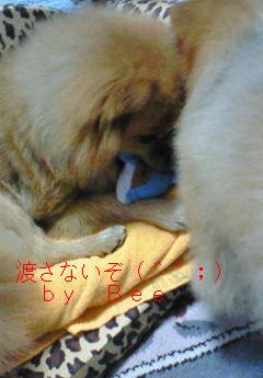 今日も時折が散らつく寒い日となっております~おぉ寒ぅ今朝、いつものようにルビーが今1番のお気に入りおもちゃ「わんこ君」を持ってきて「遊ぼうよぉ」と誘ってきました最初は私とルビーとで遊んでいたのですが・・・いつもはハウスで「うるさい」てな迷惑顔で寝ているBeeが珍しくハウスから出てきて「わんこ君」に興味を示しルビーとの争奪戦へと変貌しました「よこせぇ~」とルビーめがけ突進「渡すもんか」とギョロ目で睨むルビー逃げても追いかけ・・・すごい唸り声です「わんこ君」を口に挟んで睨みあう2匹この後は・・・必ず「おもちゃ」争いで負けるのはBeeの方(ただし、食べ物争奪戦は必ずBeeが勝つ)今朝も10分くらい争奪戦をしたらエネルギー切れのBeeはハウスにもどり寝支度一方、興奮収まらないルビーは私がに出掛ける寸前まで「わんこ君」で遊び倒してました1番若いルビーの勝ちですねぇランキング参加中です下のバナーをワンクリックお願いします