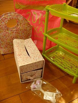 実家の父のパソコンから更新です。今年の福袋は初売りに行った実家のお嫁さんに選んで買ってきてもらいました。これが大当たりの内容で(^^)v画像の福袋「3COINS」のもので雑貨が4つ入って315円でした。見えないでしょ~右の3段ラックはお嫁さんが子供の靴を入れてもよさそうとかトイレにも、ってアイデア出してくれて、左のバッグは口がファスナー開閉で保冷シートが内側にあるので次女が「幼稚園のお弁当これに入れて~」と言って、真ん中のボックスティッシュ入れと引き出しが2段になったものはリビングに置いてもよさそうで、最終的に手前の小顔ローラーだけ、? な感じです。去年の福袋は自分で選んで一つも使えるものがなかったから、今年買うの止めようかと思ったけど、この中身なら買ってよかった。また来年もお嫁さんに選んでもらおう^^ブログランキングに参加しています。ポチっと応援してもらえるとうれしいです→にほんブログ村喪中なので新年のあいさつは失礼させていただきます。今年もゆっくり更新ですが、お付き合いいただけるとうれしいです。