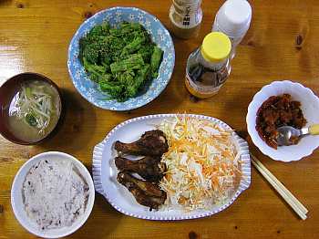 今日は晴れの予報ですが気温も高くなりそうで、部屋も明るいです。今の Pearun の部屋の様子です。(時間限定Liveです。)・朝のLive終了しました。昨日の夜は骨付き鶏肉に味噌味付きの衣をつけて揚げた物です、味が日本人好みで結構美味しかったです。キャベツと人参の千切りは、いつもの様にポン酢で食べました。付け合せは先日から時々スーパーで見かける、菜の花の胡麻和えです、今年初物でちょっと苦味があって、春を感じる美味しさでした。やっぱり今回もヘルシーで野菜中心の食事ですね。