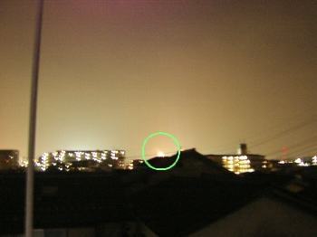 花火の音がかなり長い時間続いていたので3階のベランダに出て見たら、遠くに花火が見えて打ち上げ花火は小さく丸く見えたが、写真に収められなかった。暫く挑戦していたがどうしても写せなく、小さな打ち上げ花火の先の方だけ写す事が出来ましたけど、遠すぎて色までは写りませんでした。花火を写すのは難しいですね、感度上げすて町の明かりでまったく駄目でした。