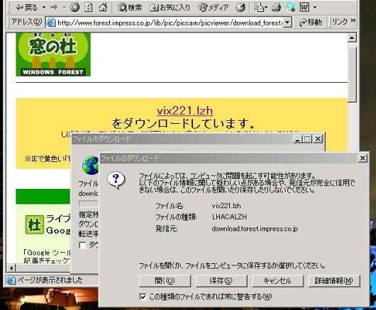 VIXの圧縮ファイルをダウンロードフリーソフトの活用と言っても、やった事の無い人もいるかと思いますので、インストール方法を簡単に説明します、すでに活用されている方は飛ばしてください。窓の杜からから使つて見たいソフト、今回はVIXの圧縮ファイル、vix221.lzh をダウンロードして、D:ドライブの my-temp4 のフオルダに保存しました。 ダウンロードしたファイルを解凍ダウンロードした圧縮ファイルをフォルダーを作ってその中に解凍します、数日前にインストールした +Lhaca のディスクトップのアイコンに vix221.lzh をドラッグして重ねると解凍先を指定するウィンドウが開きますのでD:ドライブの、my-soft を指定します。これで my-soft の中に vix221 フォルダーが自動的に出来て、その中に解凍されます。 ショートカットを作成解凍が終わると解凍先のフォルダ (d:\my-soft\vix221) が開きますので、プログラムファイルの上で右クリックし送るで、ディスクトップにショートカットを作成します。これでインストール作業は完了ですので、後はディスクトップに出来たVIXのアイコンをクリックすると使えます。