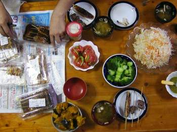 採の国の今日は1日曇りの予報です、部屋は少し暗い状態です。今の Pearun の部屋の様子です。(時間限定Liveです。)・朝のLive終了しました。昨日の晩御飯は焼き鳥を沢山買い込んで来て、適当に分けておかずにしました。これはビールの摘みにもなるし、ご飯のおかずにもなるし一石二鳥でなかなかいいアイデアかも知れません。焼きたてをゲットしたのでまだ暖かで、塩焼きにレモンを絞って食べると、焼き鳥屋で食べる摘みの雰囲気で酒が進みます。焼き鳥は野菜付きがネギ間くらいしか無いので、家にある野菜を付け合せにしました。