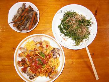 採の国の今日は午前中晴れ午後から曇りの予報です、部屋明るい状態です。またまた昨日の晩御飯です、メインはアサリパスタです、アサリもたっぷりいれたので、満足の美味しさでした。他には丘ヒジキのおひたしと人参とレンコンの胡麻和えです、丘ヒジキのお浸しはシヤキシヤキした口当たりとサッパリ感が有るので好きな料理の一品です。人参とレンコンの胡麻和えは素材の切り方で、見た目がちょつとマイナスですね。