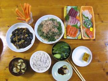 採の国の今日は午前中晴れ午後からは曇りの予報です、部屋は明るい状態です。今の Pearun の部屋の様子です。(時間限定Liveです。)・朝のLive終了しました。昨日の晩御飯は刺身の盛り合わせがメインで、他はヒジキのお浸し、炒めナスの生姜醤油かけとお新香などでした。所で刺身のツマに大根の千切りや大葉や海藻が付いていますけど、皆さんこれをどうしてます。捨てちゃう人、水洗いして味噌汁の具にしたり、勿論刺身と一緒に食べる人、それぞれですけど、Pearun は刺身と一緒に食べます。