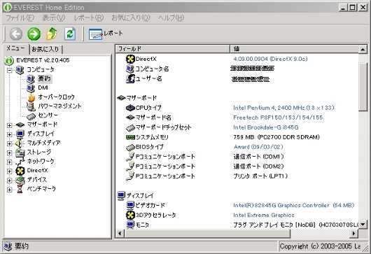 採の国の今日は夕方までほぼ1日雨の予報です、部屋は少し暗い状態です。今の Pearun の部屋の様子です。(時間限定Liveです。)・朝のLive終了しました。 起動画面今回お勧めのソフトはパソコンの情報を見る事が出来るソフトです、自分が使っているパソコンの情報をどのくらいご存知ですか、例えばコンピュータ名とかユーザー名はご存知ですか、「勿論だよ自分で買ったんだから、家のは東芝のダイナ・・・」ちょっと待って下さい、製品名では無いんですよ。そうネットワーク上でそのパソコンを特定するパソコンの名前の事です、ユーザー名は勿論使う人の名前ですけど、それらがお使いのパソコンにどんな名前で登録されているかですが、多分知らないで使っている方もいるかも知れません。EVEREST Home Edition(エベレストホームエディション)は、そんなパソコンの情報を設定内容からハードの規格や構成などなど事細かに調べてくれると言う物で、部品の選択やメモリーの増設修理などレポートを印刷して部品調達などに行ったり、パソコンをいじる方には大変役に立つソフトです。勿論 .zip 形式の圧縮ファイルで供給されていますので、適当なフォルダに展開するだけで使えますので興味がある方は使ってみてください。ダウンロードはこちらから出来ます。 http://www.altech-ads.com/product/10000755.htm