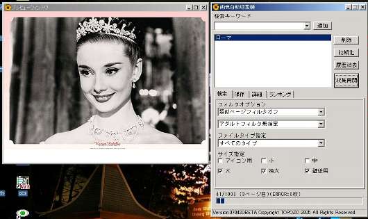 採の国の今日は曇りで昼頃にちょつと雨の予報ですが、部屋は明るい状態です。今の Pearun の部屋の様子です。(時間限定Liveです。)・朝のLive終了しました。 画像自動収集機ソフト今日お勧めのソフトは画像自動収集機です、このソフトは Googleイメージ検索を利用して、検索キーワードにあった画像を自動で保存してくる便利なソフトです、収集中にダウンロードサイトからの応答が遅いと止まった様に見えますが、応答が有るかタイムアウトになるまで待つと継続して最後まで収集してくれます。検索キーワードを設定して収集を開始すると、キーの内容で多い物はすぐに数百枚から千枚程度の画像を簡単に収集出来ますので画像を楽しむには面白いソフトです、掲載画像はキーに「ローマ」を設定して収集を始めた状態です。使って見たい方は下記、作者のページからダウンロードして下さい。http://www.mtst.jp/topozo/soft.html下の方に有る Googleの仕様変更に対応したバージョン 070420BETA WindowsXP/Windows2000 WindowsMe/Windows98 FREE インストーラー無しをダウンロードして下さい。勿論ダウンロードして適当なフォルダーに解凍するだけですぐに使えますし、不要になったら解凍したフォルダーごと捨てればOKです。