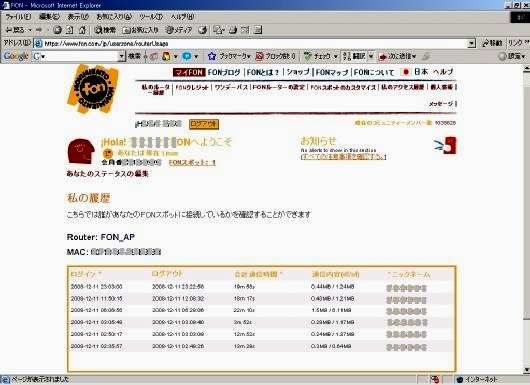 fonルーターの状態←CHの使用状況先日ゲットした「fonルーター」を取り付けました、今回設定で特に気を使った所は以下の項目です。まずルーターのパスワード、これは当然変更して桁数も多くして置いた方が安全です。次に MyPlace 側の暗号キーでこれも変更して桁数を多くして置いた方がよりセキュリティが強化出来ます。参考ですが、無線接続用暗号キーは、標準設定では、WPA TKIP となっておりますので、 WEP を使った旧製品はうまく接続できない事が有るかも知れません。【問い合わせた回答は】「弊社製品はWPA/WPA2-PSK対応となっており、現在のところWEPでは安定運用が出来ません、何卒、ご了承下さい。」次に SSID は誰にでも見れる物なので、変えても意味が無いので取り合えずそのままで、CHは近くに同じCHを使った機器が有ると競合してしまうので、接近する場合は5CH離して設定します。今回近くの家庭で1CHと7CHを使っているのと、我が家で6CHを使っているので、11CHに設定しました。(画面では1CH使用者が電源offしていた様で受信されてません。)無線LANも多くなってくると、ご近所とCHの取り合いになりますね、まあ電波が弱ければCHが接近しても、それほど影響は無いですけど。で、めでたく稼動できましたので世界中のアクセスポイントを無料で使える様になりました。http://www.fon.ne.jp/
