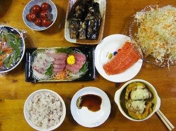 採の国の今日は1日冬晴れの予報で、部屋は明るい状態です。ネタ切れなので「昨日の晩御飯」です、メインは、ぼっちゃんカボチャの肉詰め焼です。他には刺身と茄子の生姜焼き、トマト、キャベツの千切りサラダなど数点でした。カボチャの肉詰めは、ぼっちゃんカボチャが半分なので、結構ボリュウムがあり、ご飯を少し残してしまいましたけど、カボチャの甘みが美味しかったです。昨日のルーターの設定をいじるのに時間を取られ手抜ブログです。