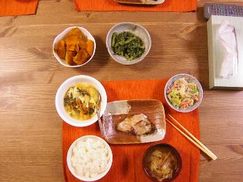 採の国の今日は1日冬晴れの予報で、部屋は明るい状態です。またまたネタ切れで「昨日の晩御飯」です、メインは焼き魚で、他に豆腐と野菜の入った玉子スープ、ハムと野菜入りポテトサラダ、春菊の胡麻和え、南瓜の煮物でした。南瓜はホクホクに煮る為にネットで調べた裏技でお茶で煮て、さしすせその順番で味付けをして見ました。結果は水に煮たのと比較していないので、何とも言えませんが、今までの煮方より少しはホクホク感が増した様な気はしました。