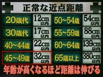 採の国の今日は1日小雨がしとしとの寒い予報で、部屋は暗い状態です。今の Pearun の部屋の様子です。(時間限定Liveです。)・朝のLive終了しました。最近パソコンを見ていて目の疲れが酷くなった感じがして来ました、そこで100均で度が合いそうな眼鏡をゲットして来ました。所が先日TVを見ていたら歳と共に、近点距離とかがだんだん伸びていくのだそうで、Pearun もいい歳なので、この表を見て納得しましたが、皆さん歳相応ですか避けて通れないのがいやですね。この表は目のレンズが焦点を結びはっきり見える一番近い距離って事の様です。