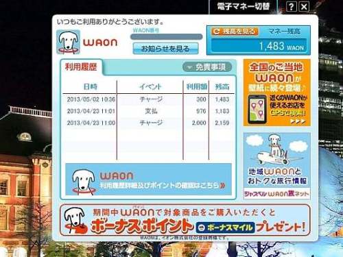 採の国の今日は曇り時々晴れの予報です、部屋は明るい状態です。今の Pearun の部屋の様子です。(約7時~10時頃の時間限定Live)・節電の為本日のLiveは中止します。 ポイントを300円分チャージしたWAONのポイントが若干溜まったので、期限切れにならない内に電子マネーに変えちゃう事にした。この操作を自宅のパソコンからするのは初めてなんですけど、操作は簡単でWAONのネットステーションにログインして、ICカードリーダにWAONカードを乗せて、ポイント数を入力してチャージするだけです。今回は300ポイント電子マネーに替えましたが、しっかり300円チャージされてます、使った ICカードリーダはSONYのパソリです。パソリの最新バージョンSONY ソニー 非接触ICカードリーダー/ライター PaSoRi パソリ RC-S380[メール便のみ/代引不可/送料込み]【YDKG-kd】【smtb-KD】[変換・コンバータ]