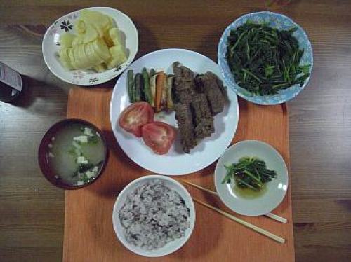 採の国の今日は雨一時曇りの予報です、部屋は少し暗い状態です。今の Pearun の部屋の様子です。(約7時~10時頃の時間限定Live)・節電の為本日のLiveは中止します。「昨日の晩ご飯」は牛肉巻きがメインで他には、何だか解らないちょつと苦い感じのする菜っ葉の素茹で、沢庵、ワカメの味噌汁も付けました。牛肉巻きの中身はグリーンアスパラ、人参、茸などが入っています、付け合せはトマトと、肉巻きで余った具です。突然味噌汁をチョイスしたので、この味噌汁はインスタントですが、今回も美味しく頂ました。