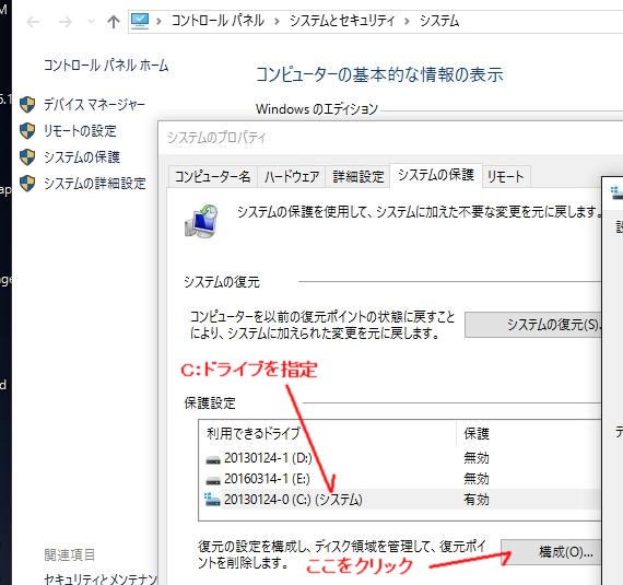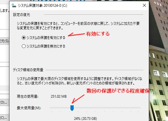 設定は左下のウィンドーのアイコンの所で、マウスの右クリックをして、システムを選択し開いた画面の左側の、システムの保護をクリックして、後は写真の様に設定するだけです。