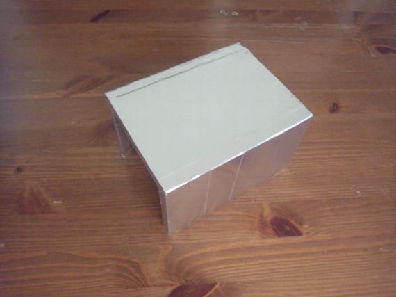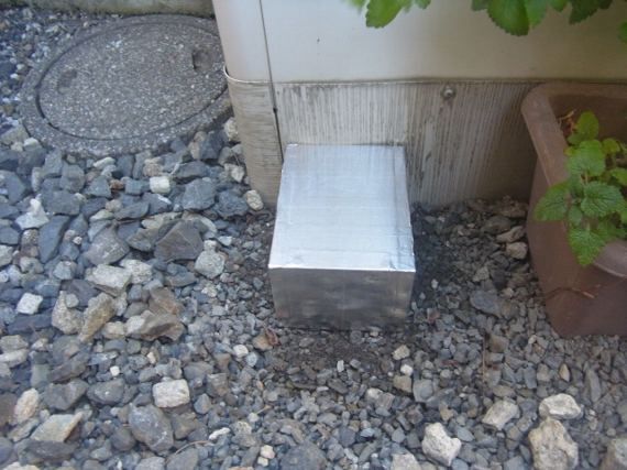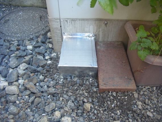 木工遊びで作ったエコキュートの配管カバーに、アルミ箔を貼りつけ設置しました。