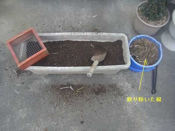 プランターいっぱいに根が張っていて、端の方から少しづつ削って、根を取り出し最後に細かな根を網マスを使って取り除き、何とか柔らかい土がふっかっしましたので、野菜の土と苦土石灰を混ぜ込んで置きました。