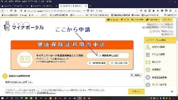 後は マイナポータルサイト を開いて、ICカードリーダーでログインを、クリックしてログインします、トップページに健康保険証利用の申込と言う項目があるのでそこから申込します。