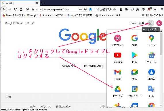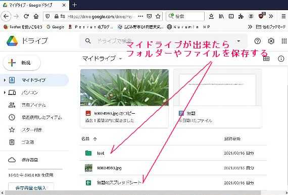 Google Chromeなどのブラウザーを使っている人は Googleのメールアドレスをお持ちの方も多いと思いますので、1 の画像操作だけで使う事が出来、2 の画像の様にファイルやフォルターを保存出来、複数のパソコンやスマホからアクセス出来ます。
