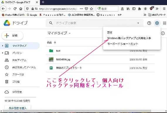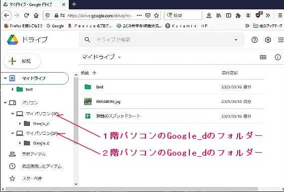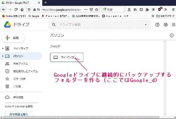 この状態でもうお気に入りは、1階のパソコンと2階のパソコンで共有は出来ていますが、更に便利にする為に、5 画像6 画像の様に Googleドライブに継続的にバックアップするフォルダーを作りました。