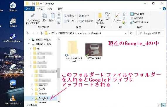 今回作ったフォルダーは、パソコンの D:ドライブの D:/my-tempの中に Google_dと言うフォルダーを作って、7 画像の様に継続的にバックアップするフォルダーにしました。