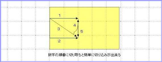 やり方はイラストの様に、最初の1と2の切り込みは平行ケージなどを使って、真直ぐに切り込みを入れ、後は書いた線に従って、3~5を切り落としていくと簡単に出来ます。