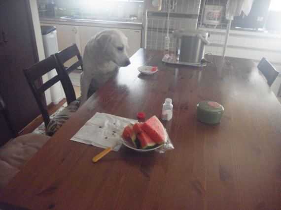 猛暑なので久しぶりにティアラと冷たく冷やしたスイカを食べました、美味しそうにガツガツと食べていましたが、カメラを向けるとなぜかカメラ目線なります。