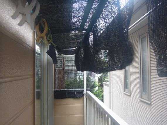 台風が関東を通過するとの予報でしたので、台風に備えてベランダの日除けが飛ばされたり、固定している物干し竿ごと飛ばされない様に、竿を針金で固定したり、日除けの面積を半分して、残りの半分は、風になびく様にしました。