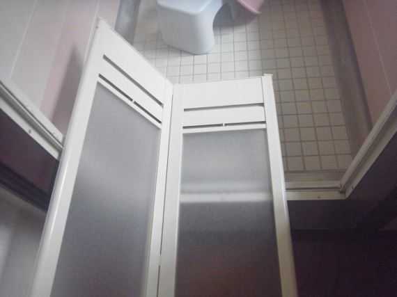 その状態で、折り戸の下の部分に水をかけて洗うと、その水が折り戸を伝って、脱衣場に流れちゃうので、毎回掃除の時は段ボール箱などを台にして、折り戸の脱衣場側を高くするようにして、洗っていました。