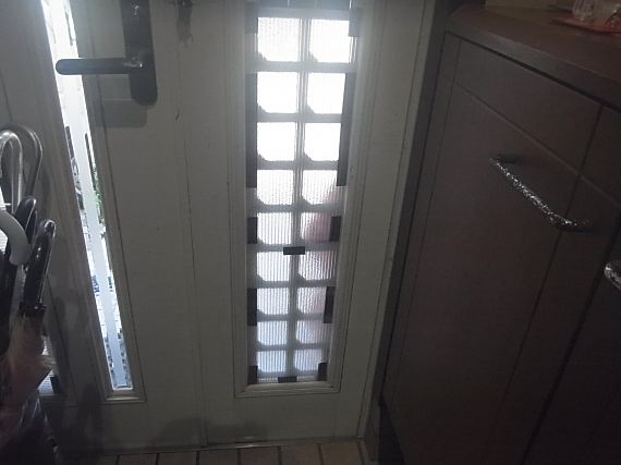 玄関ドアの右と左のガラス面の断熱対策で中空ボードを張り付け ていたんですけど、寒くなって両論テープの接着力が落ちたのか、剥がれてしまったので、今度は両論テープのりょうを更に増やして見ました。