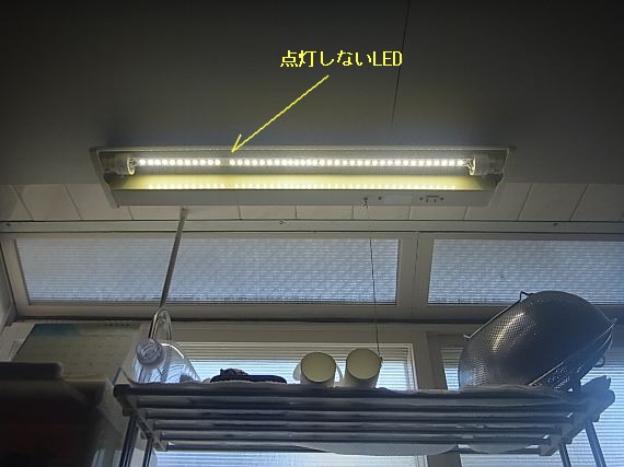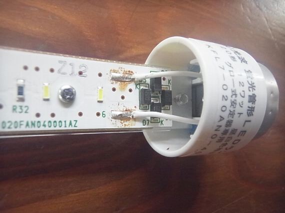 取り合えず中を取り出した、LED蛍光管を点灯管を取り外した、元の器具に設置して見た所ちゃんと点灯し不良のLEDが1個見つかりました、これが影響して点滅などが発生しているんでしょうけど、不思議なLED蛍光管です。