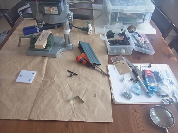玄関ドアの升目の部分に取り付ける為に、100均のプラスチックまな板を、升目の大きさにカットして、固定用の穴を空け、ネジ止め出来る様にリベットも取り付けました。