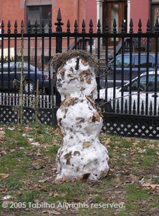 アメリカの雪ダルマは大抵「お団子」状態。3段だ。知り合いの子供に雪だるまの絵を描いてと言われて適当に日本の2段の雪ダルマを描いていたらそれは、雪ダルマではないと怒られてしまった。ちなみに名前は大抵「フロスティ」だ。公園にいた怪しいフロスティ。お散歩中のヨークシャーテリアが恐ろしい勢いで吠え掛かっていた。