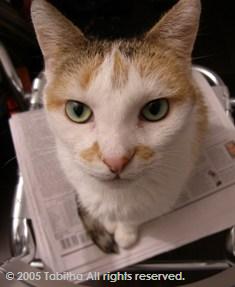アメリカでは、毎朝新聞を取りに行くのは犬のお仕事と相場が決まっているが…。猫のお仕事は、新聞を取りにいくことではない。猫のお仕事は、もちろん新聞の上に乗ることである。この意味で言えば、我が家のネコは大変な働き者だ。朝の日課。さて。数年前に、藤の猫つぐらを見つけて買ったのだが…。これが、気に入らないらしく、ちっとも入ってくれない。タオルを敷いても 「ぷいっ。」フリースを敷いても 「ぷいっ。」「猫磁石」なんていう名前で売っていたペット用クッションをわざわざ買ってきても 「ぷいっ。」しょーがないので新聞を入れたら、すっとんできて…10秒後には、こんな感じ…。しかし、この光景、前にもどこかで見ましたね…。