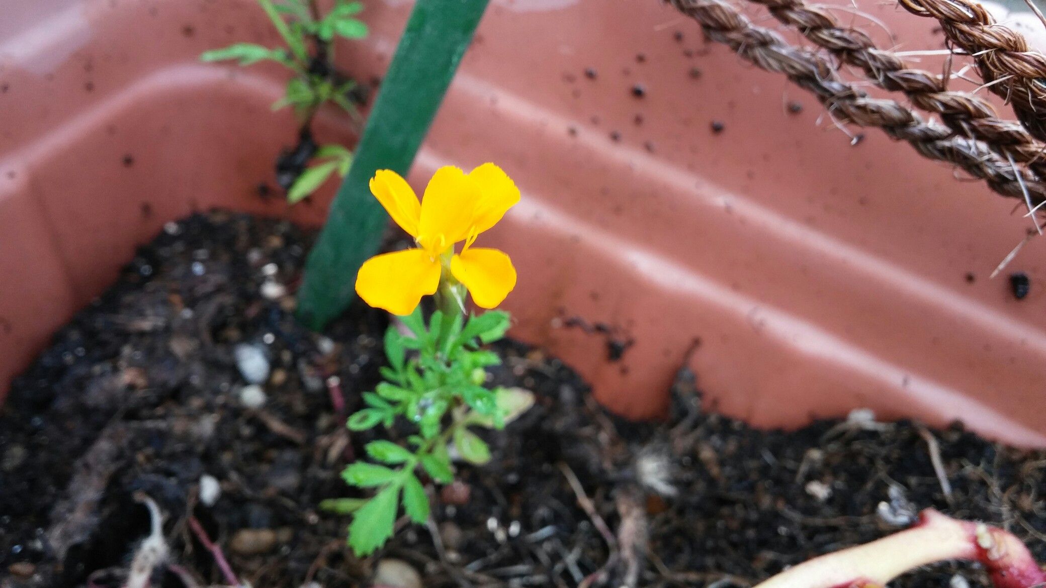 夕方は風が涼しく気持ちが良かったです❗。花の水やりをしているときに見つけた小さいオレンジ色のお花。 どこかから飛んできたみたいです♪。